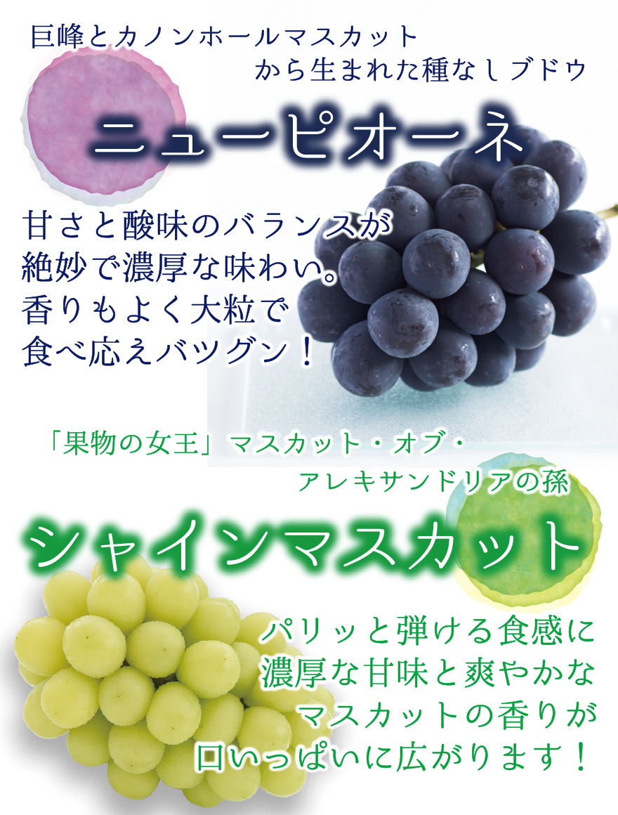 🍇ニューピオーネは、甘さと酸味のバランスが絶妙で、濃厚でとても良い香りがします。弾けんばかりで、果肉が締まり、見た目・食感ともに優れています。