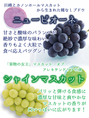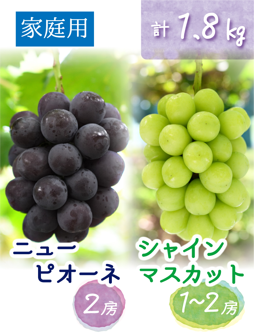 花笑み農園で1番人気がある、ニューピオーネ2房とシャインマスカット大1~中2房の食べ比べセット(家庭用)です。
