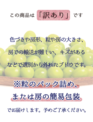 訳ありの理由は、(1)房の形が悪い、(2)粒の大きさが小さい、(3)房の大きさが小さい、(4)色が悪い、(5)粒の表面に傷が付いている、などです。そのため粒にしてパックに入っていることがあります。