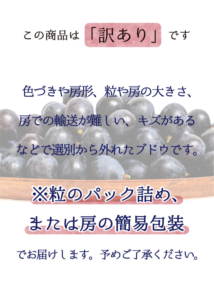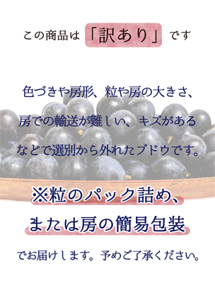 訳ありの理由は、①房の形が悪い、②粒の大きさが小さい、③房の大きさが小さい、④色付きが悪い、⑤粒の表面に傷が付いている、などです。そのため粒にしてパックに入っていることがあります。