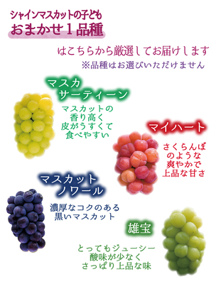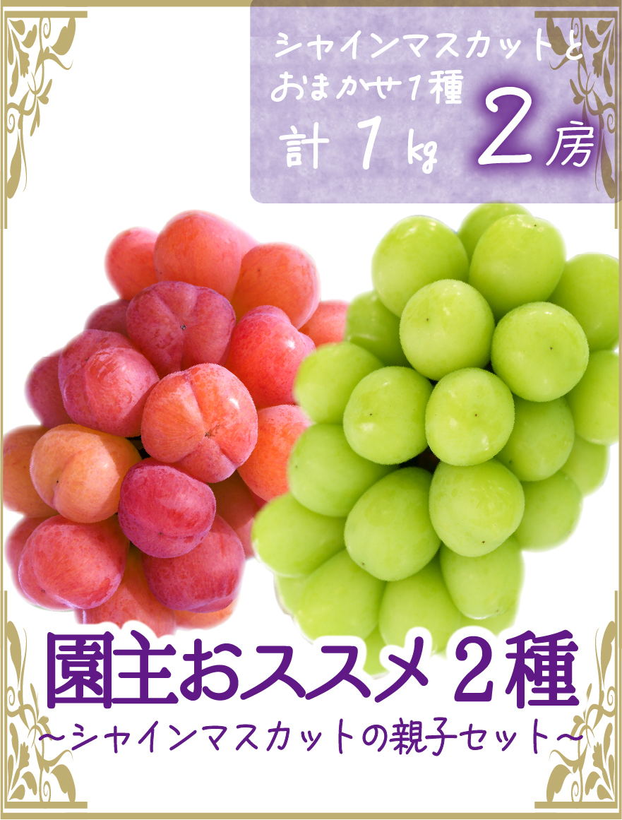 園主おすすめのシャインと、シャインの子供のレア品種が入ったぶどう2種食べ比べセットです。園主の好きな品種で、おすすめのブドウを食べきりやすい2房(各1房)入りでお届けいたします。