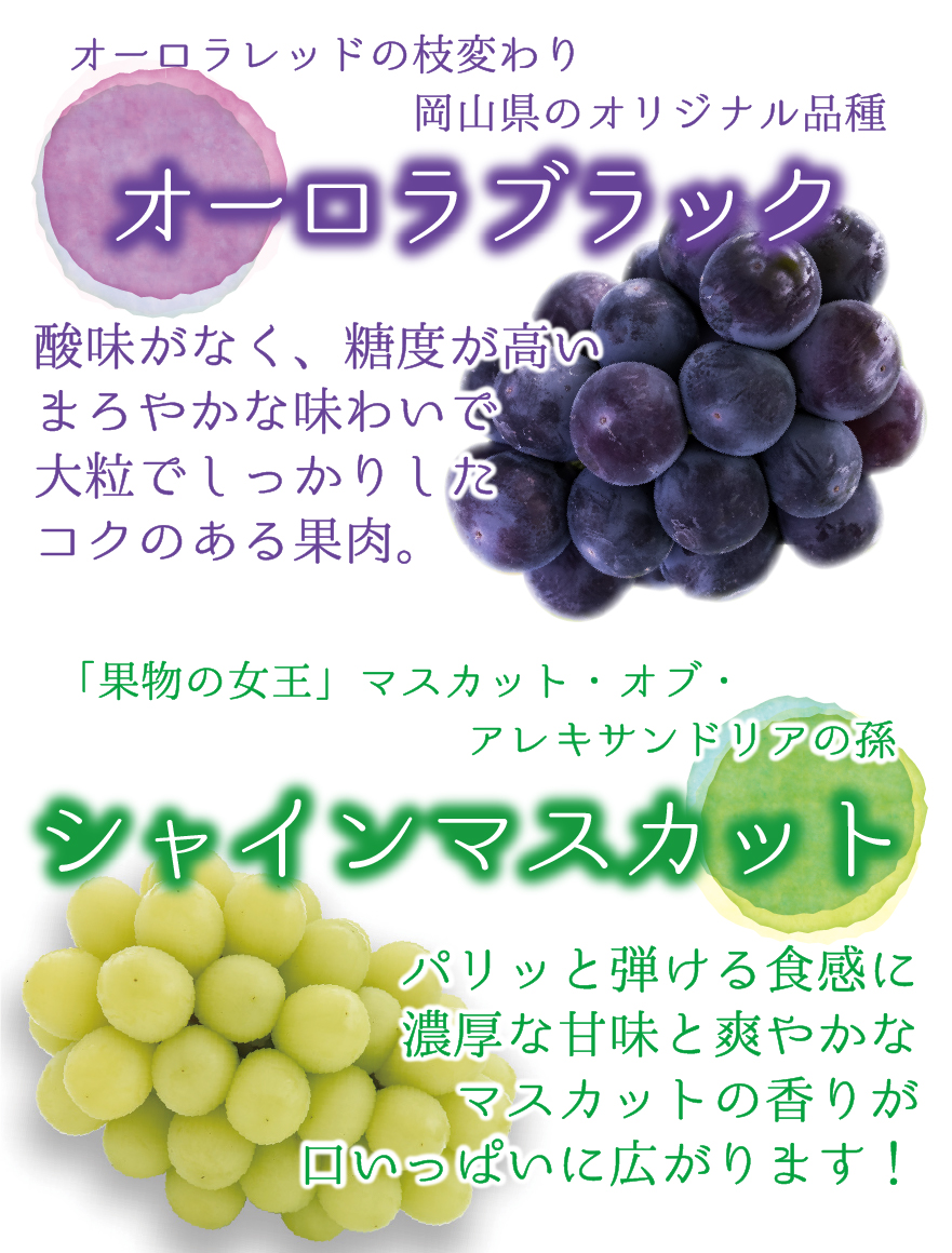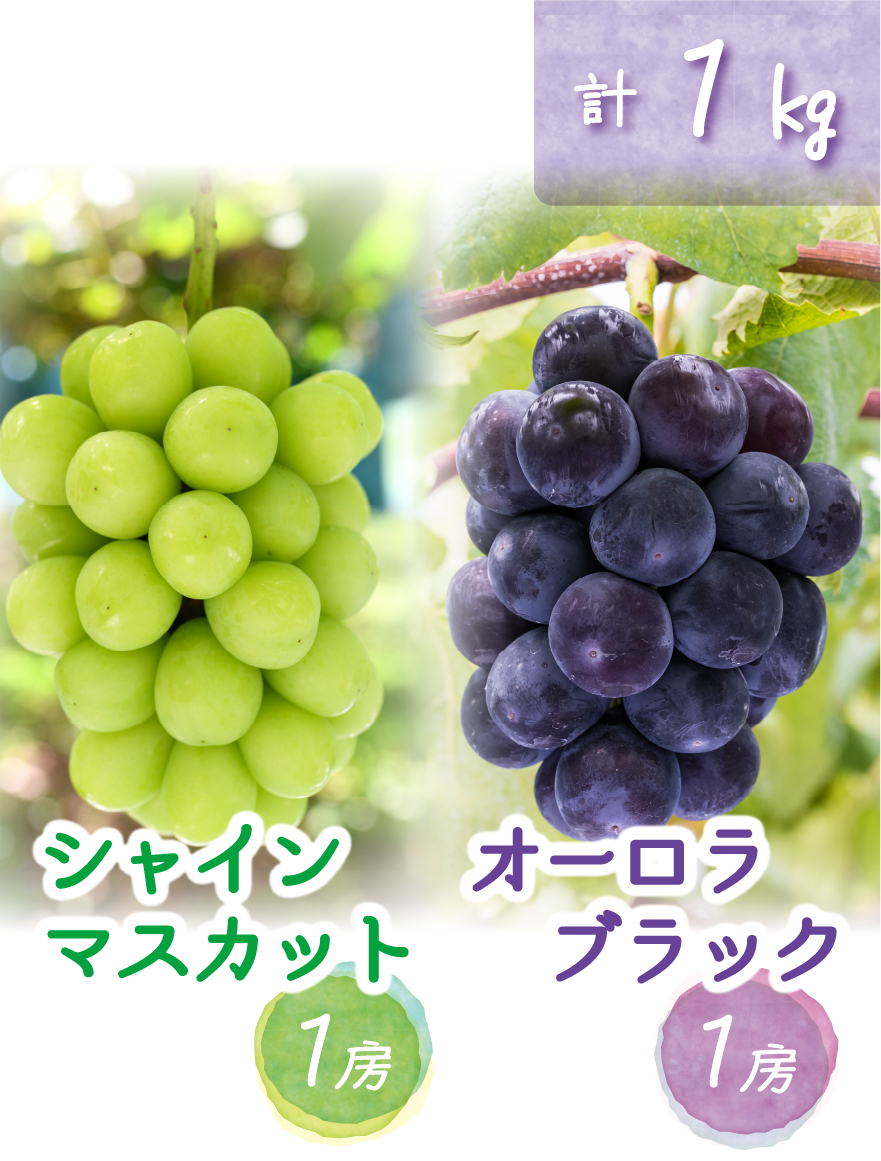 花笑み農園人気がある、オーロラブラックとシャインマスカットの食べ比べセットです。食べきりやすい2房(各1房)入りでお届けいたします。