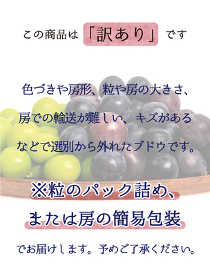 選別で規格から外れたブドウ1kgをお届けいたします。 訳ありの理由は、①房の形が悪い、②粒の大きさが小さい、③房の大きさが小さい、④色付きが悪い、⑤粒の表面に傷が付いている、などです。そのため粒にしてパックに入っていることがあります。