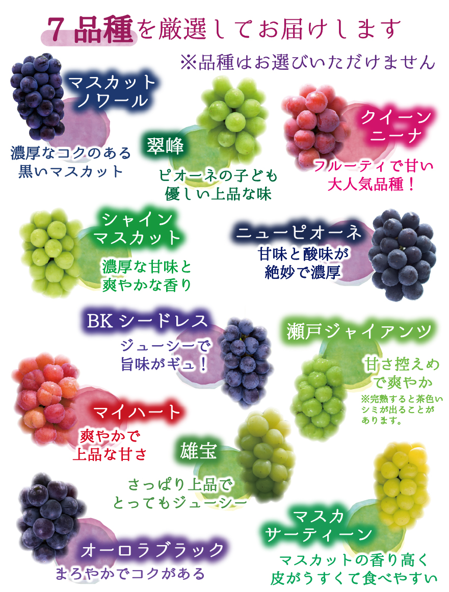 花笑み農園の個性豊かな7ブドウたちをまとめてお届けいたします。花笑み農園で選別された中でも最上位クラスを入れています。