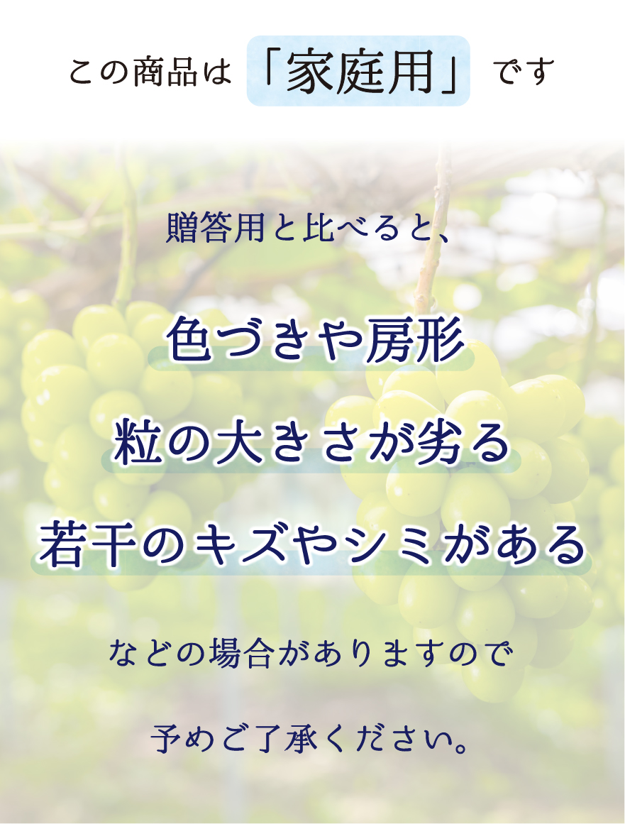 ※ご家庭用は贈答用と比べると、粒が小さかったり、房の形が悪かったり、表面に傷が付いている場合があります。