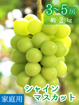花笑み農園の甘くて香り高いシャインマスカットを3~5房入りの約2kgでお届けいたします。たくさん食べたい方向けのご自宅用の商品です。